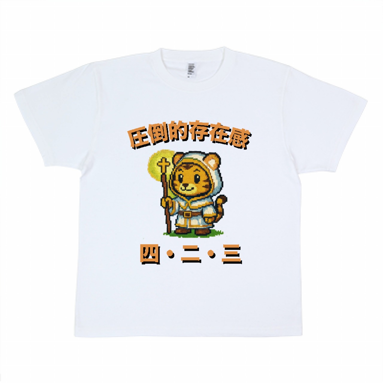 胸元には力強い言葉「圧倒的存在感」、その下には「四・二・三」を刻み、