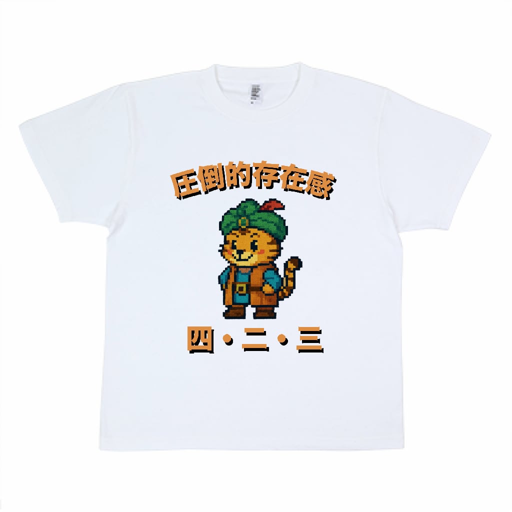 胸元には力強い言葉「圧倒的存在感」、その下には「四・二・三」を刻み、