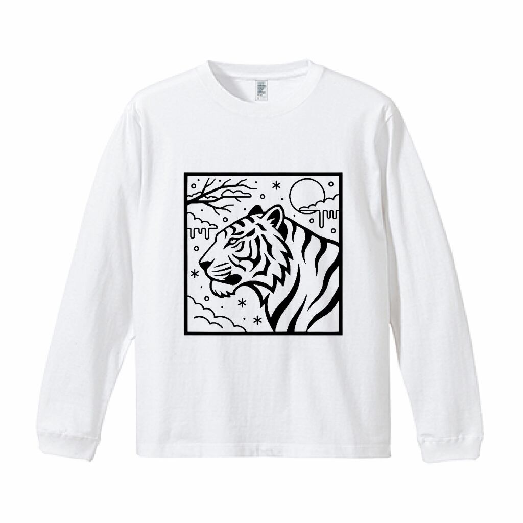 静寂の中に宿る力強さ。 通算21作品目となる今回のテーマは「虎」。 太いラインで表現された虎の柄と、繊細な空の描写を融合させました。長袖のキャンバスに映える正方形のフレームデザインは、一枚で着ても、インナーとして覗かせても主役級の存在感を放ちます。